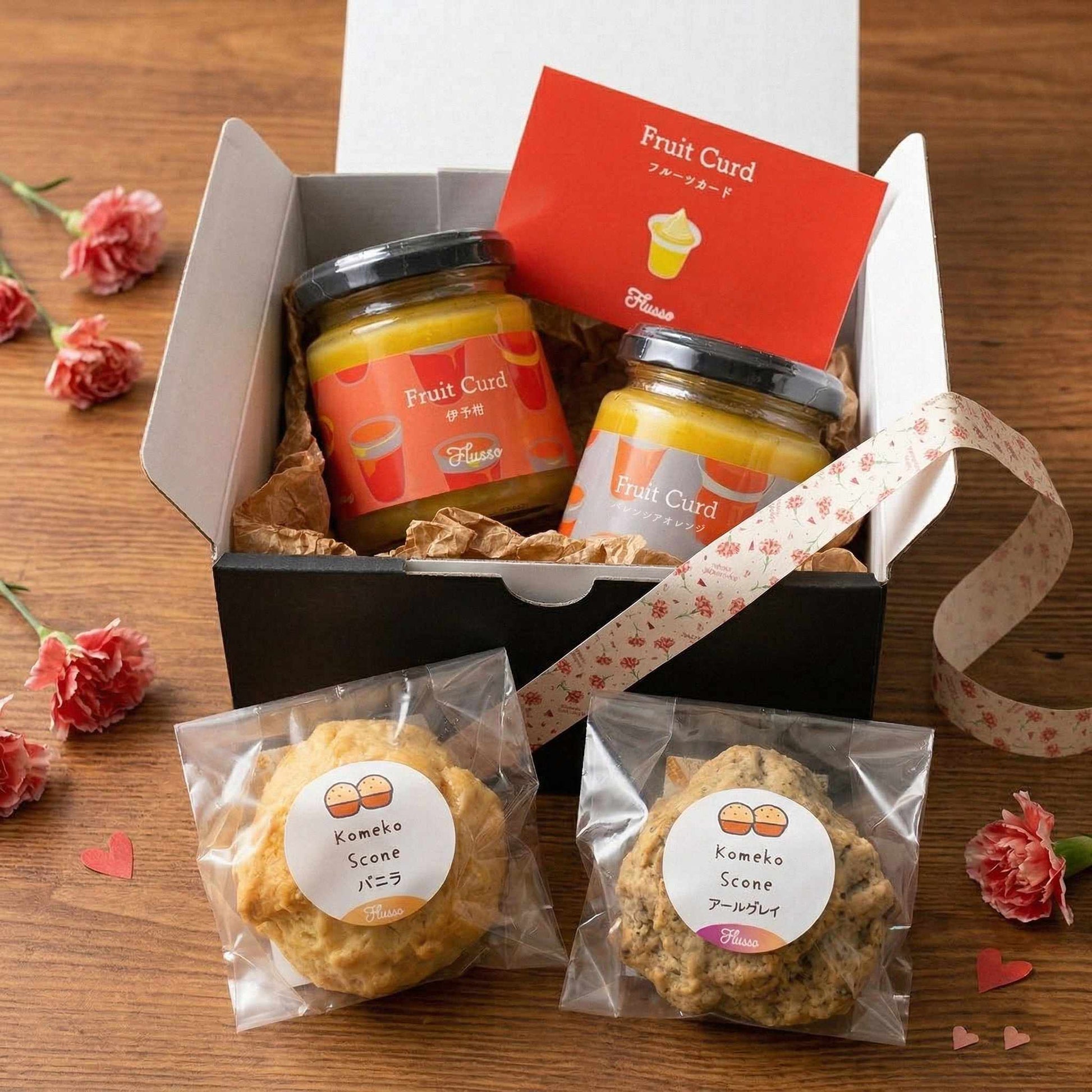 母の日の贈りものにおすすめの、Flussoで人気のフルーツカード2種と米粉のスコーン2種を詰め合わせたギフトセットです。