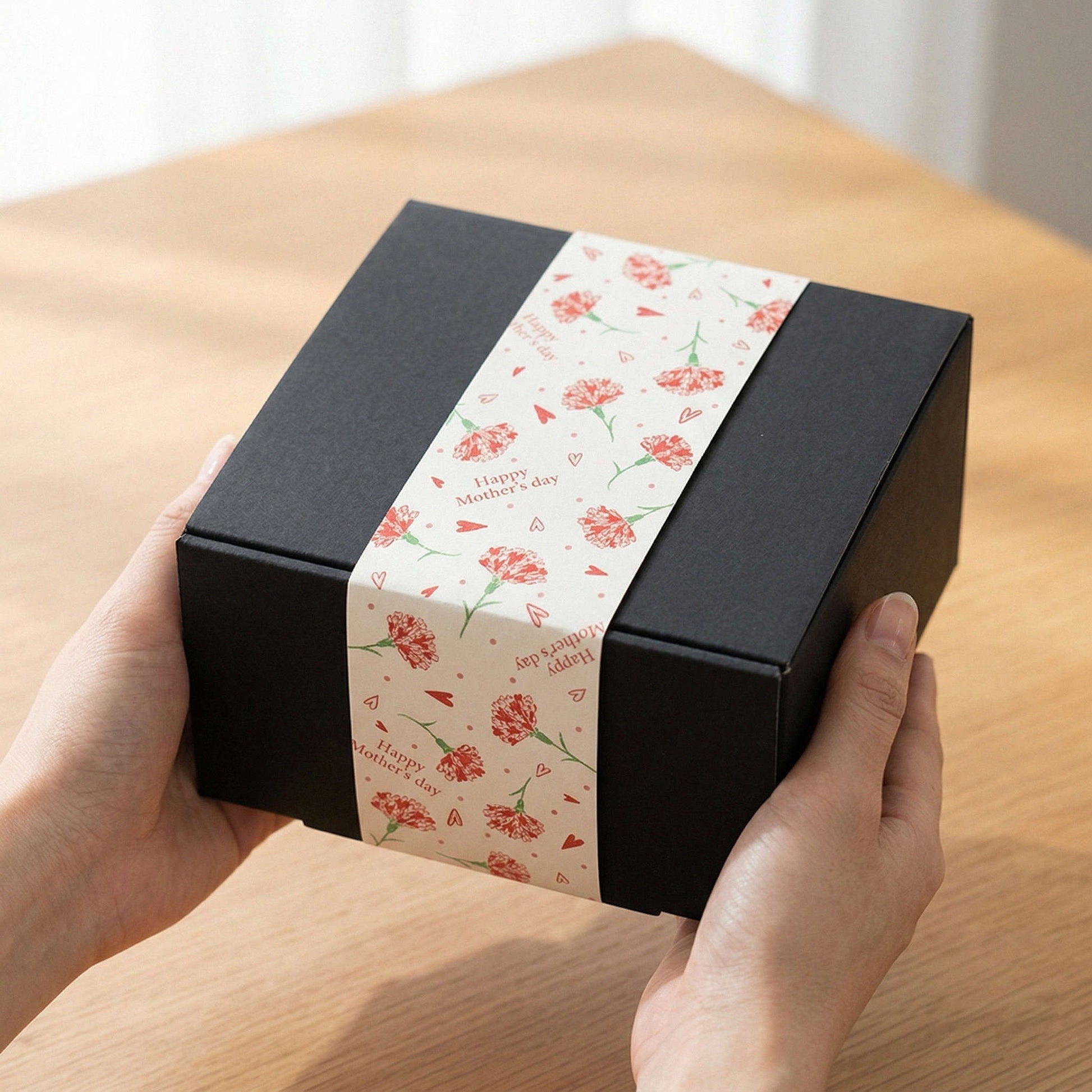 黒いギフトボックスにお入れし、カーネーション柄のラッピングをサービスでお付けしてお届けします。